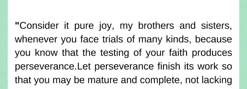 “Consider it pure joy, my brothers and sisters, whenever you face trials of many kinds, because you know that the testing of your faith produces perseverance. Let perseverance finish its work so that you may be mature and complete, not lacking anything.”