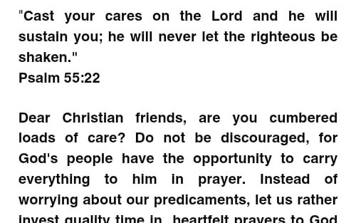 Dear Christian friends, are you cumbered loads of care? Do not be discouraged, for God’s people have the opportunity to carry everything to him in prayer. Instead of worrying about our predicaments, let us rather invest quality time in heartfelt prayers to God and he will surely sustain us as we are admonished in his word.