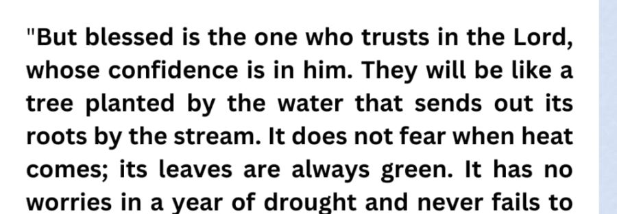 “But blessed is the one who trusts in the Lord, whose confidence is in him. They will be like a tree planted by the water that sends out its roots by the stream. It does not fear when heat comes; its leaves are always green. It has no worries in a year of drought and never fails to bear fruit.”
