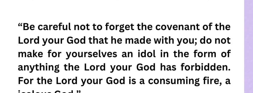 “Be careful not to forget the covenant of the Lord your God that he made with you; do not make for yourselves an idol in the form of anything the Lord your God has forbidden. For the Lord your God is a consuming fire, a jealous God.”